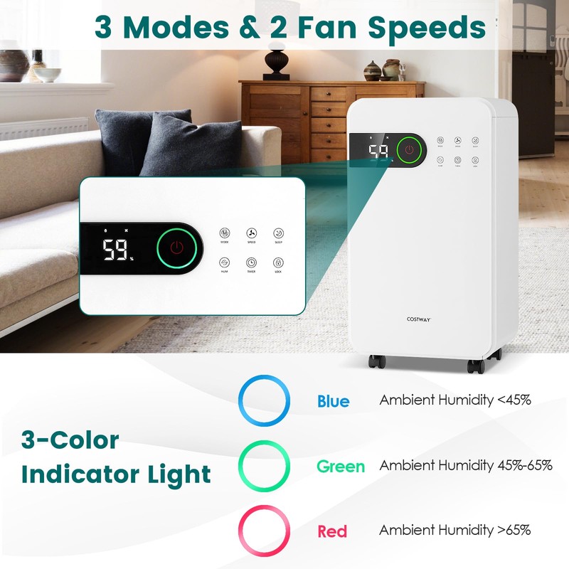 - 【3 Modes, 2 Speeds & 3-Color Indicator:】This dehumidifier is available in 3 modes (auto, continuous drying, sleep) and 2 fan speeds (high, low), offering you customizable comfort. Besides, the operation is easy with the LED display and touch control panel. Plus, the 3-color indicator light shows different colors according to the ambient humidity: blue, <45%; green, 45%-65%; red, >65%.