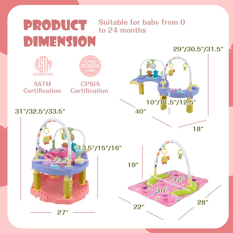 This 3-in-1 baby activity center can be used as a play mat, a bouncing saucer or an activity table to accompany your baby from 0 to 24 months. Besides, both bouncing saucer and activity table have 3-level adjustable height, offering a comfortable experience for babies at different growth stages. With bouncing, rocking and fixing mode, this versatile baby play center can satisfy various demands of the baby. And the 360° rotatable seat allows the baby to play with all toys without effort. Plus, the padded play mat is comfortable to lie or sit, and it is washable for easy maintenance. Made of safe materials, you can use this ASTM & CPSIA certified baby activity center with confidence.