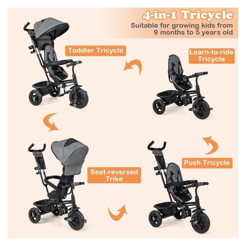 Costway 4x1 Baby Toddler Trike Tricycle Removable Canopy Adjustable Push Handle 3 Wheel