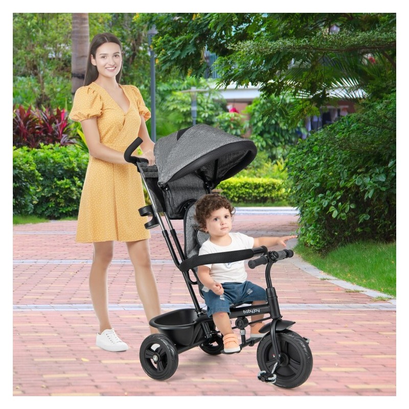 ● 4-in-1 Detachable Toddler Tricycle :The multifunctional tricycle features detachable canopy, seat cushion, guardrail and push handle for easy conversion. You can easily switch it into a toddler tricycle, a seat-reversed trike, a push tricycle or a learn-to-ride tricycle to fit fast-growing kids aged from 9 months to 5 years old. Weight capacity of the seat: 55 LBS.