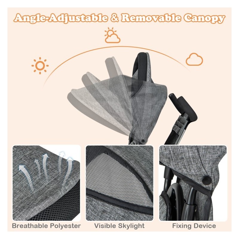 ● Reversible Seat and Adjustable Design:The seat can be reversed for different uses, so that your little one can face inside for better care or face outside for view enjoyment. Besides, the canopy can be adjusted into 2 positions according to different weather conditions. Visible skylight of the canopy allows parents to easily observe their kids.