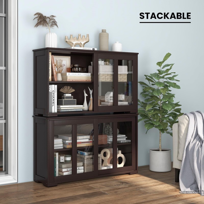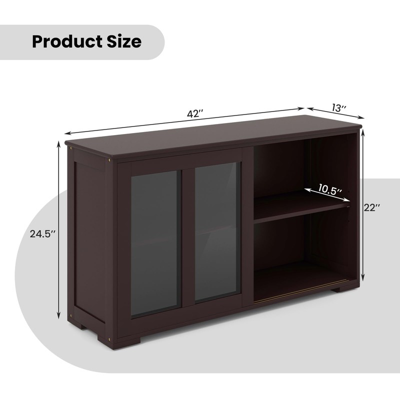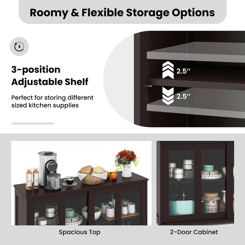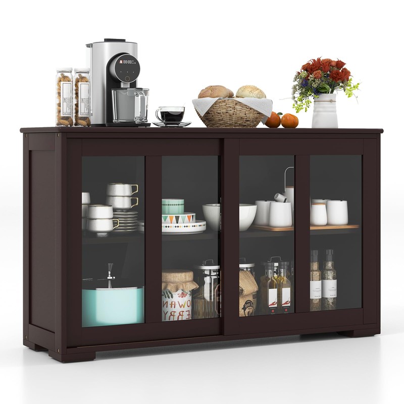 COSTWAY Buffet Sideboard with Storage, 2-Door Floor Cupboard with Sliding Tempered Glass Cabinet & Adjustable Shelf, Stackable Storage Cabinet for Kitchen, Entryway (Brown)