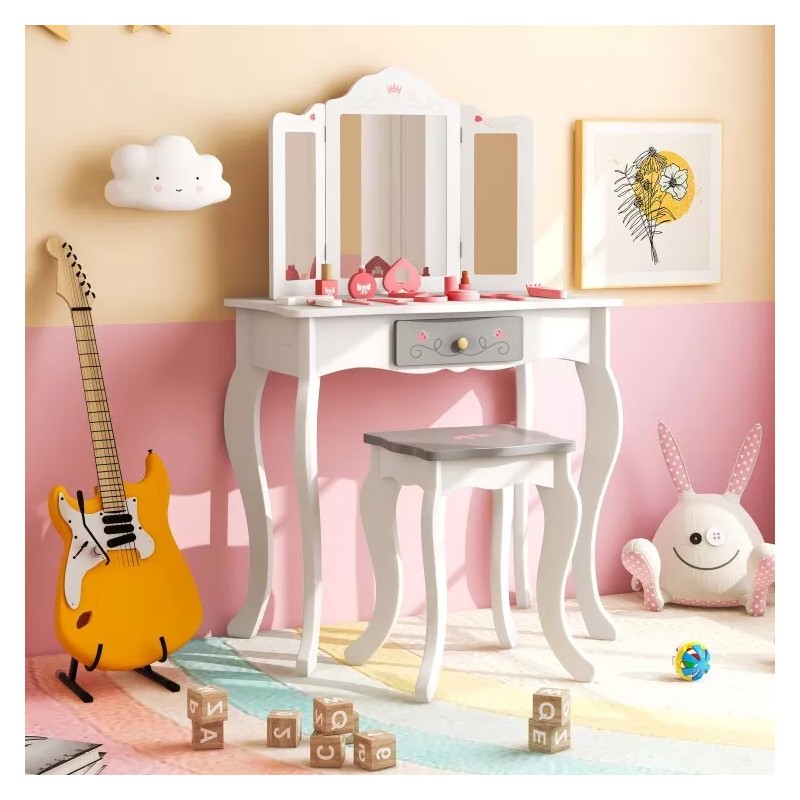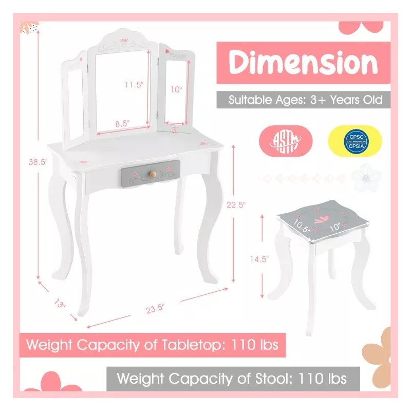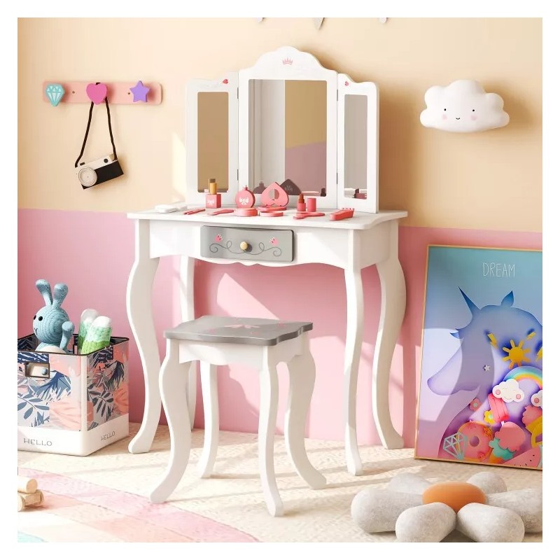 Girls Vanity Makeup Dressing Table & Stool Set Gift Kids With Tri-Folding Mirror