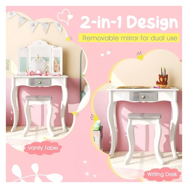 Costway Girls Vanity Makeup Dressing Table & Stool Set Gift Kids With Tri-Folding Mirror