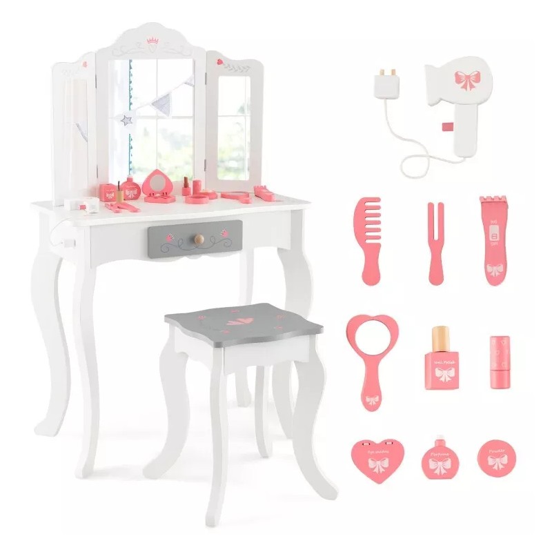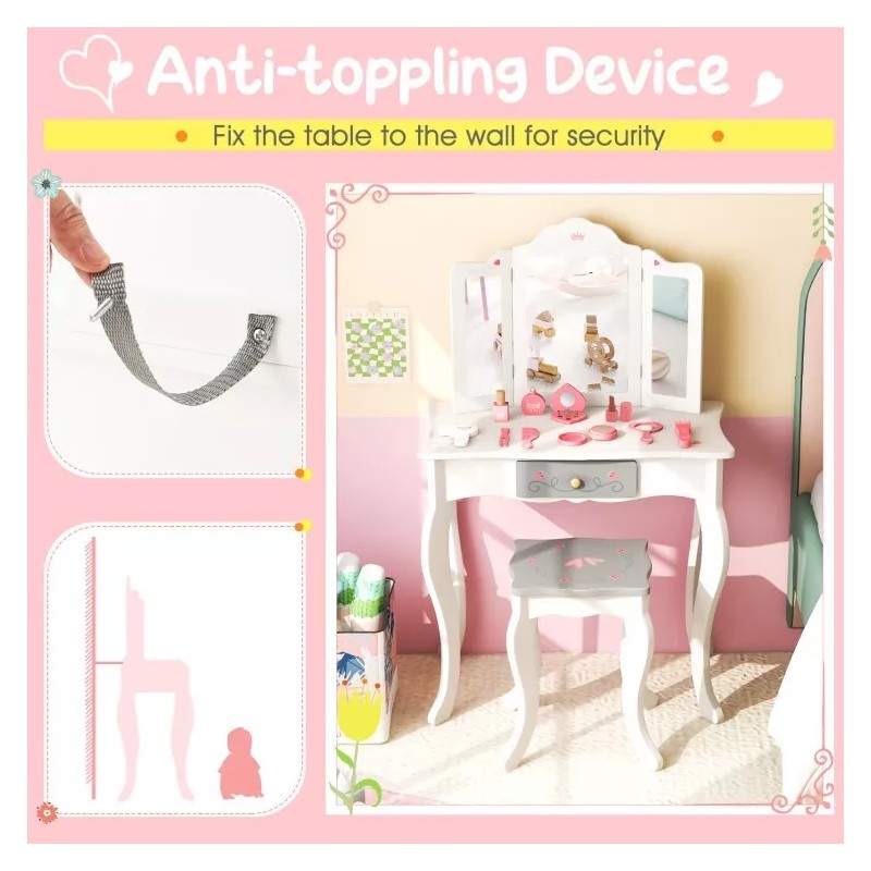 ● Practical Mirror and Drawer: The kids vanity set boasts a safe HD acrylic tri-folding mirror which allows kids to find the perfect angle for dressing up. What's more, designed with a practical drawer, the princess vanity table holds children's various belongings.