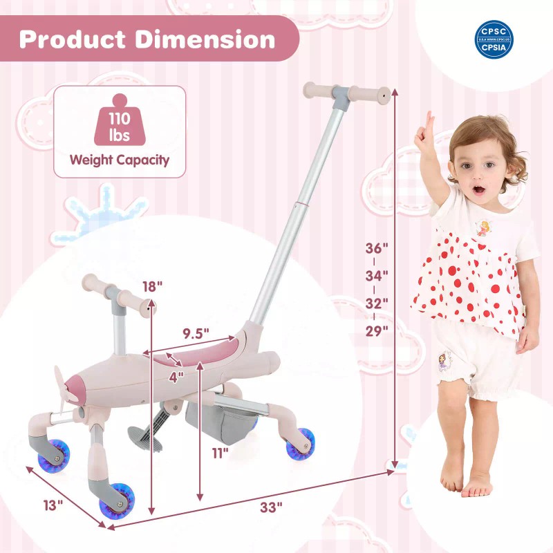 This ride on push car switches between a parent-push mode and a child-driven mode, catering to kids of varying ages. Ensuring the coziness of parents, the ride on toy features a 4-position adjustable parent handle with a detachable design. While the anti-slip handlebars and cozy PU seat provide comfort for kids. Never lacking in entertainment, the push car includes colorful LED lights for unparalleled fun. Crafted with premium aluminum tubes and PU wheels, this push car is built to last as your child grows. Additionally, the large storage basket allows for easy access to toys and items. Boasting a plane-themed design, this ride on toy car is the perfect gift for children aged 18-60 months old. It enhances the development of confidence, balance, and motor skills, while also fostering parent-child interaction.