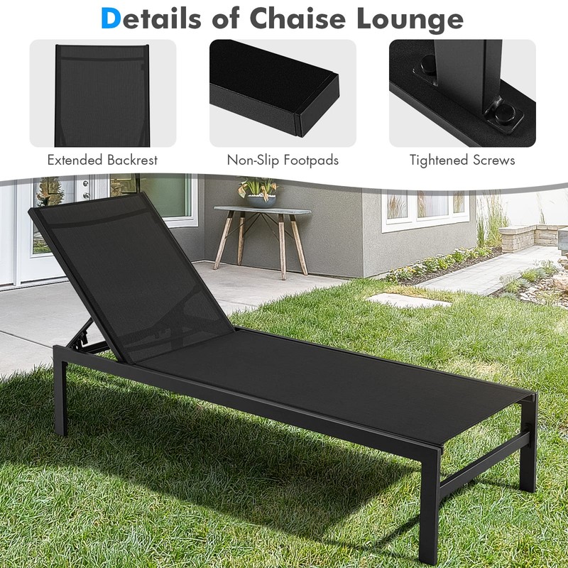 - [Aluminum Frame]: Crafted from premium-grade aluminum pipes, the main frame of this chaise lounge is lightweight compared to steel, yet equally robust. The aluminum construction also boasts excellent rust resistance for prolonged durability. Additionally, non-slip footpads safeguard floors from scratches.