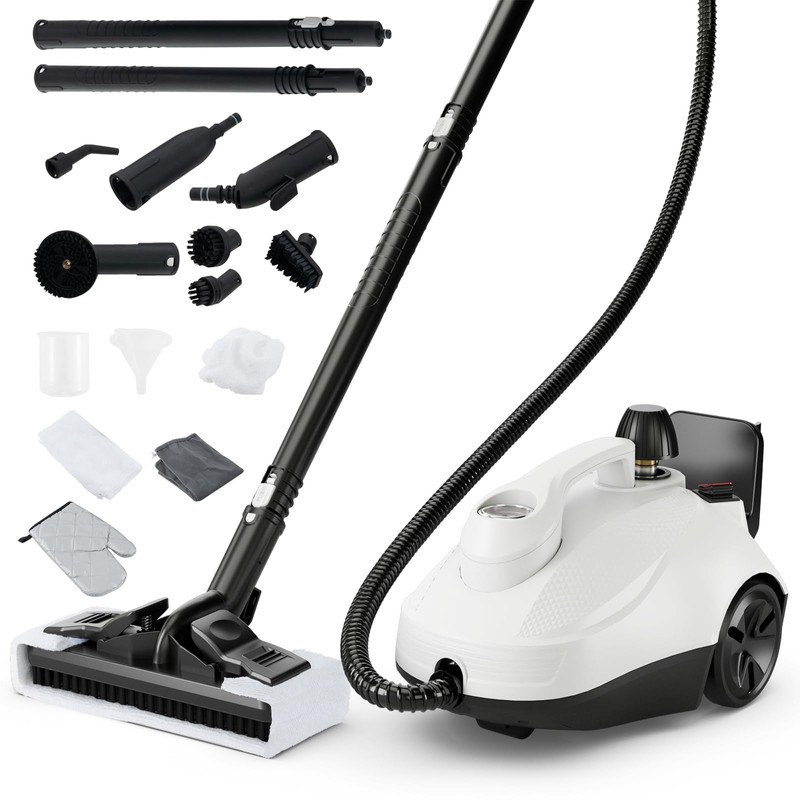 The 1800W steamer heats up to 320℉ and operates at 72.5 PSI for deep cleaning. It includes 15 attachments for different surfaces, including round brushes, floor scrub brush and cleaning cloth, measuring jug, etc. In addition, the steamer is portable with wheels and a handle. The cleaning machine features a 16.5 ft long power cord to ensure large activity range. Safety features like a pressure gauge and overheat protection are included. The 61 oz water tank makes it easy to use - simply add water, choose a nozzle, and wait 8-10 minutes for it to heat up. More user-friendly details await your discovery.
