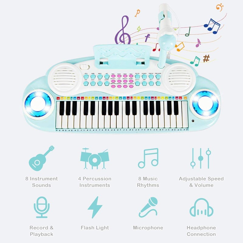 - ♪♪Record & Create Your Own Music: Convenient "Record & Playback" can help children record their own songs and impress their children's musical talents. It is also available to use an earphone to be more joyful.Two power supply modes to powered by 3 AA batteries or a USB cable.