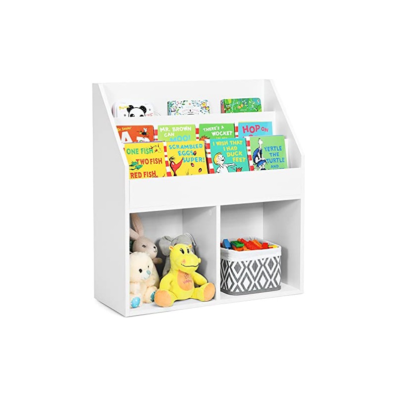 - 🧸【Perfect Height & Humanized Design】: The perfect kid-sized height of wooden bookshelf allows toddlers see the book selection and pick out what they want while exercising toddler's reading and organization skills. Thanks to the round corners, you don't have to worry about your kids getting hurt accidentally during the process of organizing and reading.