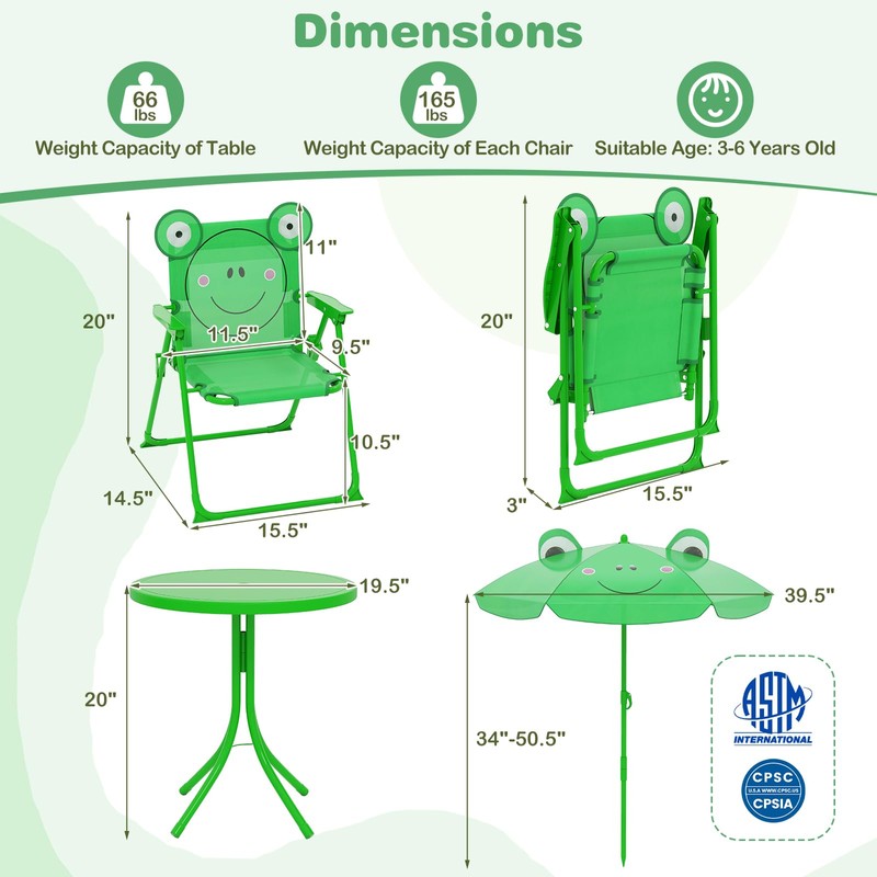- Compact & Portable Design: Designed for convenience, the umbrella and 2 chairs can be easily folded. Besides, the entire kids outdoor furniture only weighs 9 lbs. Thus, it's space-efficient for storage and easy for carriage, ideal for outdoor activities such as beach trips, picnics, or playdates in the park.