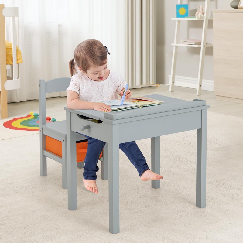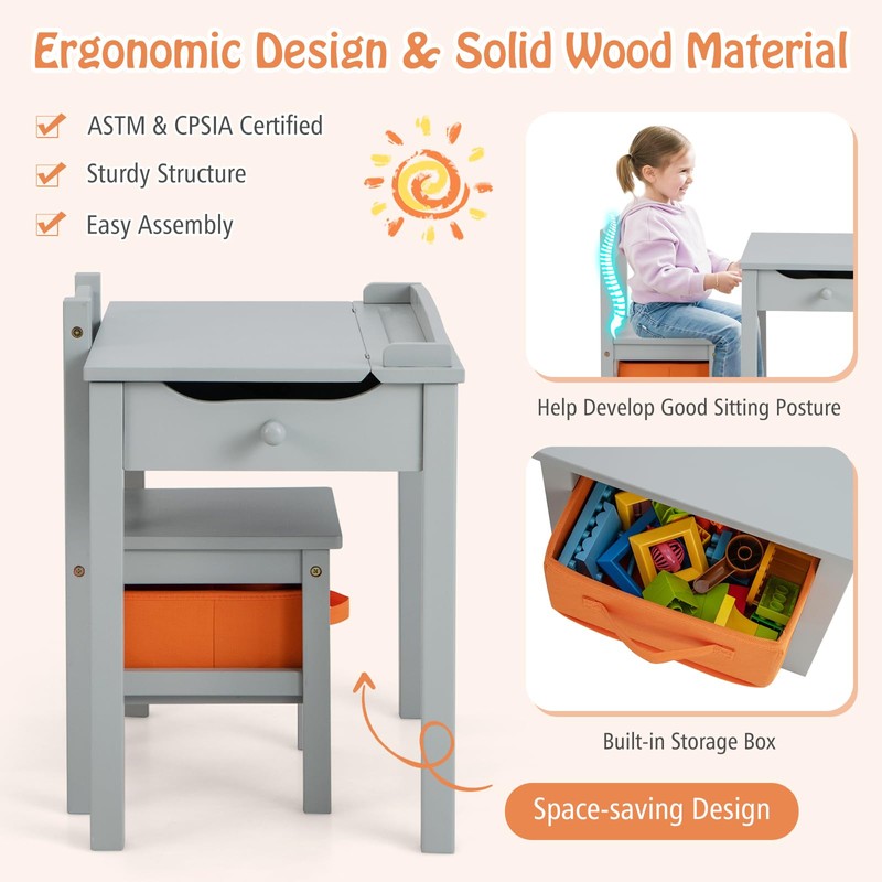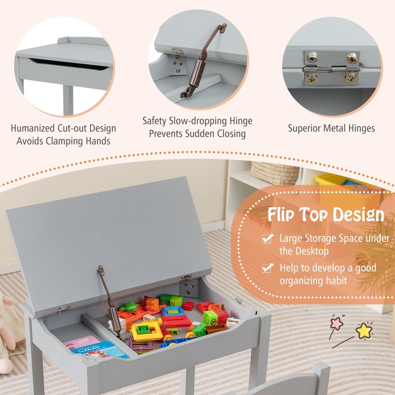 Costzon Kids Table and Chair Set, Flip Top Toddler Study Desk w/Chair for Playroom & Nursery, Wood Activity Table Set w/Storage Space, Safety Hinge, Pull-Out Drawer & Hook for Arts, Crafts (Grey)