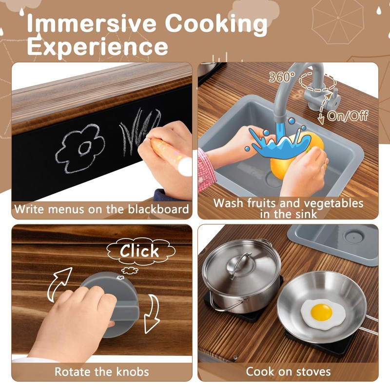 Crafted from TSCA certified fir wood, the kids mud kitchen is designed for years of energetic play. Children can enjoy an immersive cooking experience as they create on the blackboard, turn the knobs to make “click” sound, and cook on the stoves. Besides, the removable sink allows for versatile play, whether washing pretend fruits and vegetables or playing with water and mud. This outdoor kitchen is a perfect gift for children over 3 years old, encouraging creativity, hands-on skills, and a love for cooking. Furthermore, the outdoor play kitchen has a top storage shelf, middle storage shelf and bottom storage shelf that promote organization and responsibility.