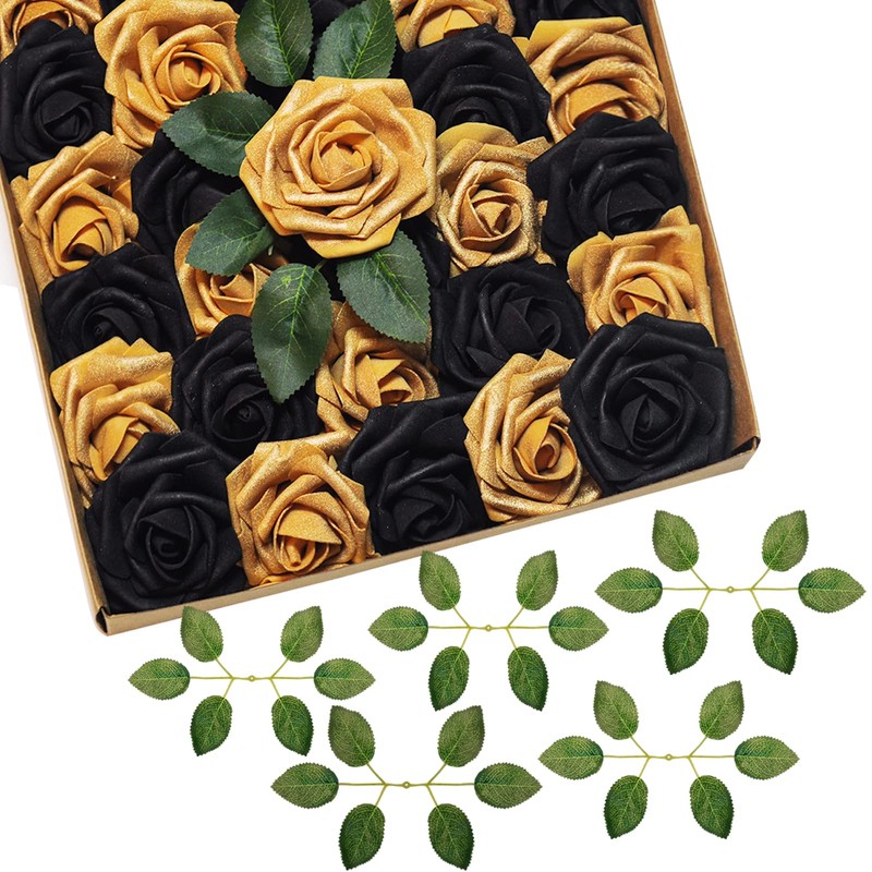 - FEATURE: Black and gold artificial flowers have flexible thin wire stem. It makes the black roses be very easy to bent, cut down or pull out as you need. Gold and black fake flowers are perfect for making bouquets, centerpieces, kissing balls, boutonnieres, cake flowers or any other flower decorations, centerpieces and gold floral arrangements.
