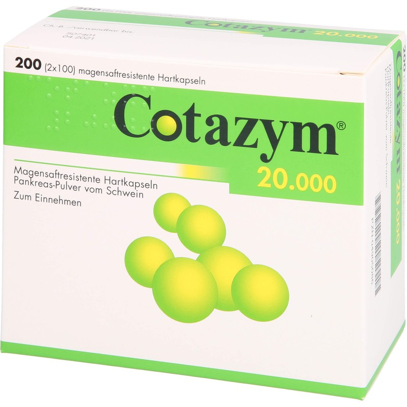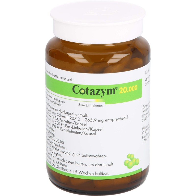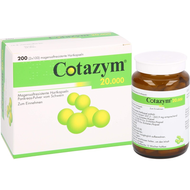 Cotazym 20.000 - magensaftresistente Hartkapseln Wirkstoff: Pankreas-Pulver vom Schwein. Anwendungsgebiete: zum Ersatz von Verdauungsenzymen bei Verdauungsstörungen (Maldigestion) infolge ungenügender oder fehlender Funktion der Bauchspeicheldrüse (exokrine Pankreasinsuffizienz).