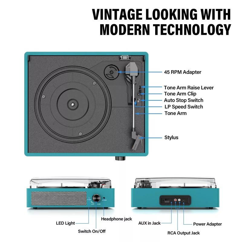 【Stylish & Retro Record Player】The LP player perfectly combines fashion and retro, easy to use, especially suitable for beginners. It adopts a three-speed turntable design (33, 45, 78 RPM), supports your 7" 10" 12" vinyl records, simple and smooth operation, allowing you to enjoy your music collection.