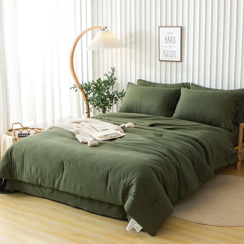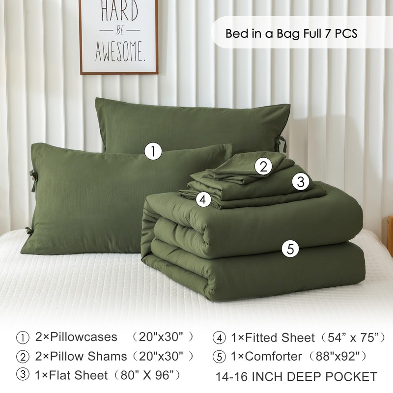 COTTEBED Ultra-Soft Full Size Sheet Sets with Comforter - All Season Use 5 Piece Bed in a Bag, Aesthetic Boho Washed PolyCotton Full Comforter and Bedding Fitted Sheet Set Pillowcase, Dark Olive Green