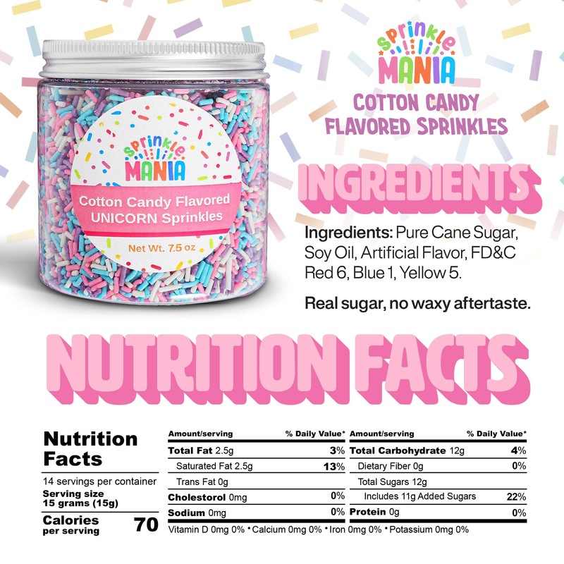 - Delicious Cotton Candy Flavored Sprinkles: Experience amusement park nostalgia with our cotton candy crunch topping. These vibrant sprinkles capture sweet airy light flavor in every cotton candy crumble bite!
