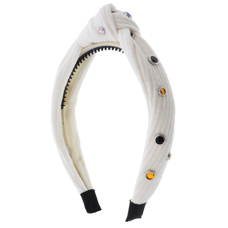 Cotton Twist Knot Headband with Colored Rhinestones - White