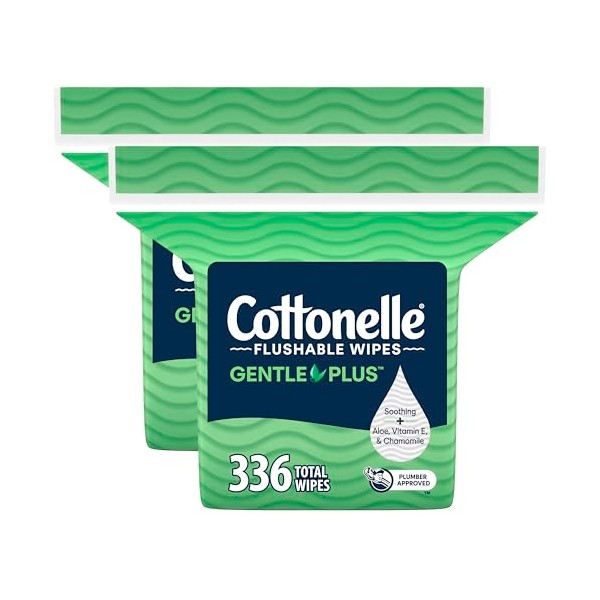Cottonelle GentlePlus Flushable Wet Wipes with Aloe & Vitamin E, 2 Refill Packs, 168 Wipes Per Pack (336 Total), Packaging May Vary