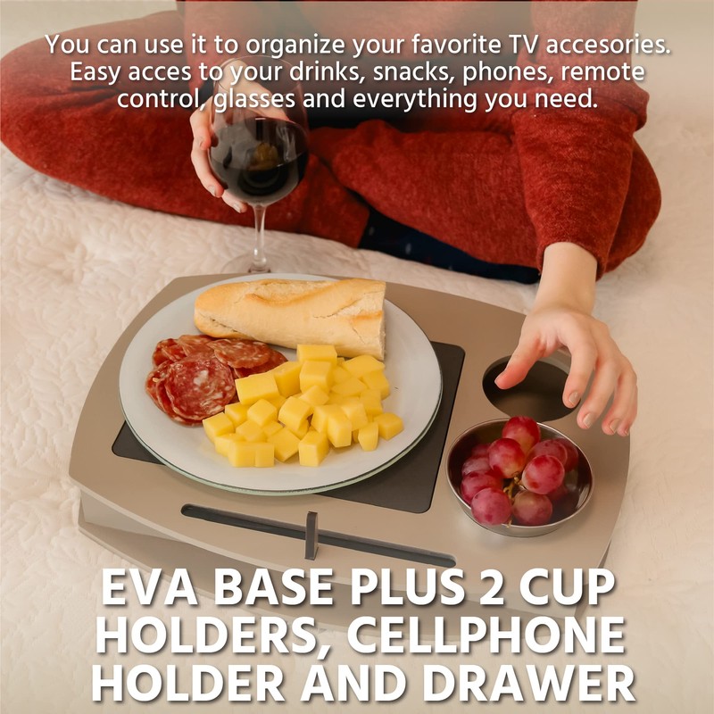 - Lounge with Ease - With our bed table tray / couch rest tray / tray for eating, you can relax on your sofa or bed while having everything you need within your reach. This lap tray table has an Eva base, 2 drink holders, a cellphone or iPad holder and a drawer organizer for easy access to your snacks, gadgets, glasses, remote control, cell phone, drink and more.