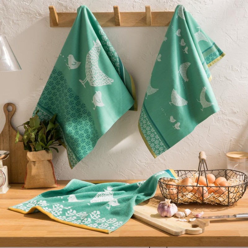 - Bring a little sweetness and authenticity with our Cocotte and its two little ones. This simple and charming tea towel with its blue and green tones will bring a warm touch to your kitchen, whether in the country or in the city! For a harmonious set, you can complete this linen with the Poulettes tea towel or the square terry Cocotte which are in the same shades.