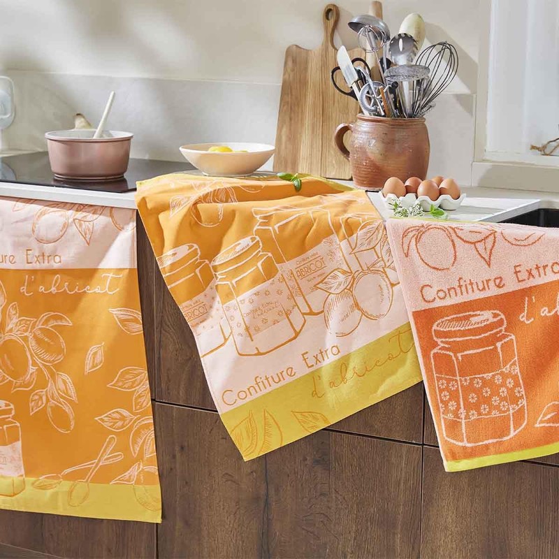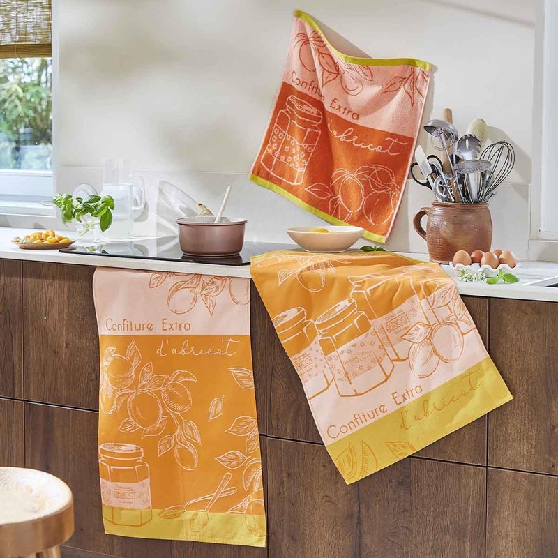 - Let yourself be enchanted by the gentle and sunny atmosphere of the "Delice d'Apricot" towel. With its motifs of juicy apricots and jam jars, it is reminiscent of the deliciousness and summer aromas. An ideal decorative and functional piece to brighten up your kitchen.