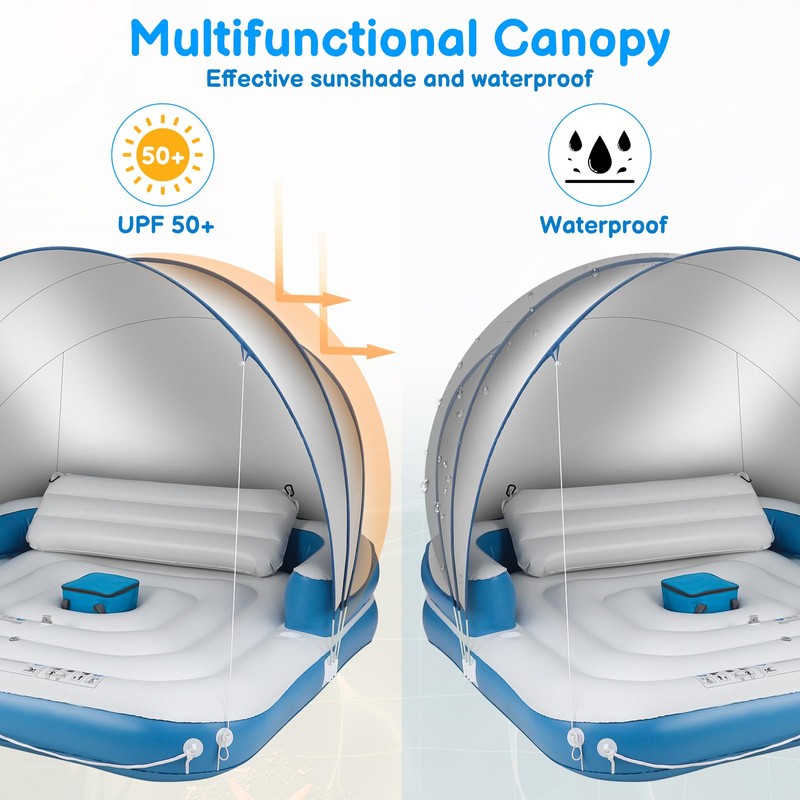 - Versatile Canopy Design: The canopy on this inflatable island floats for adult is made of 190T silver-plated fabric and is equipped with UPF 50+ sun protection to block 97 percent harmful UV rays. Adjust the angle as needed or remove the canopy to enjoy the sunshine, suitable for lake, pool or beach use, combining the functions of sun pads, pool floats, lounge chairs and more