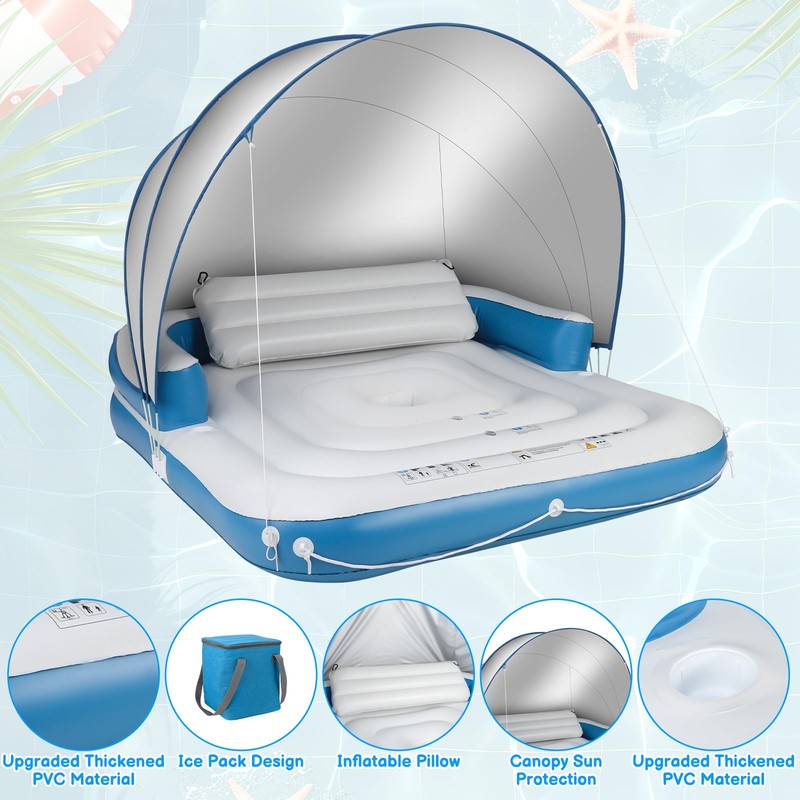 - Adult Pool Float: This pool float inflatable island for adult comes with a canopy design, ergonomic reclining armrest design, 2 sturdy cup holders, ice packs and Inflatable backrest that allow you to relax in the pool while avoiding the harsh light. Both a water lounger and a floating island, float with canopy lets you and your family and friends enjoy the sun and water activities while on a lake holiday