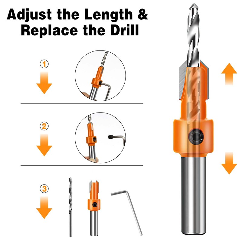 - Removable and adjustable: each countersunk drill metal supplied hex key can help you remove screws. It can also adjust the drilling depth of screws of different lengths to improve work efficiency. A good helper in our daily life.
