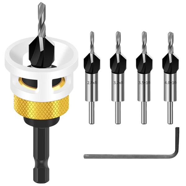 - Package includes: the 6-piece set of countersink includes 4 different sizes: 2.8 x 8 mm, 3.2 x 8 mm, 3.5 x 10 mm, 4 x 10 mm, and comes with standard 1/4 inch hex shanks and Allen keys, which allow you to easily adjust the depth of the countersink metal, making your woodworking more efficient and accurate he