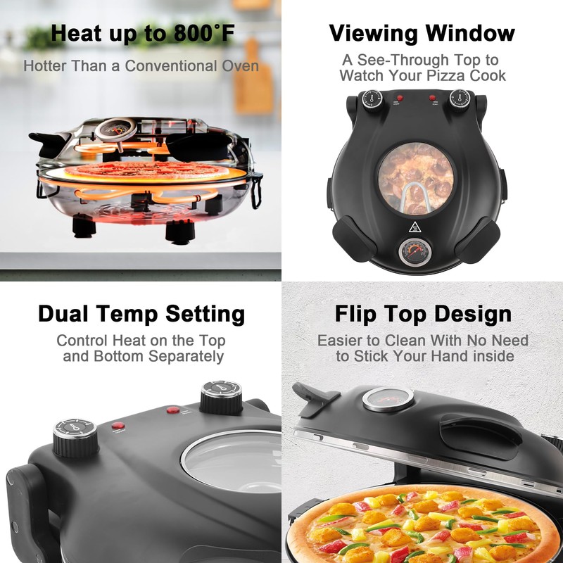 - ADJUSTABLE CONTROL PIZZA OVEN:Pizza Maker featuring adjustable top and bottom heat settings, you can customize the temperature for an even bake every time.The built-in thermometer and display can monitor cooking progress, ensuring ideal baking conditions.