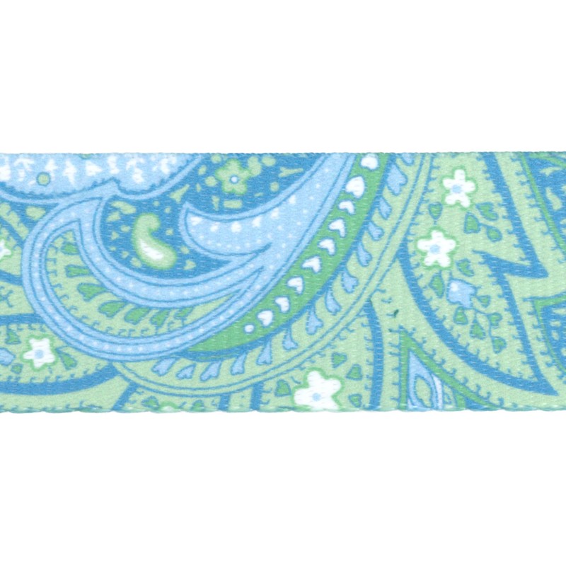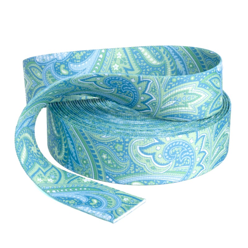 - 5 YARDS | 1 1/2 INCH WIDTH | GREEN PAISLEY | A trendy array of swirling paisleys against a soft green and blue background.
