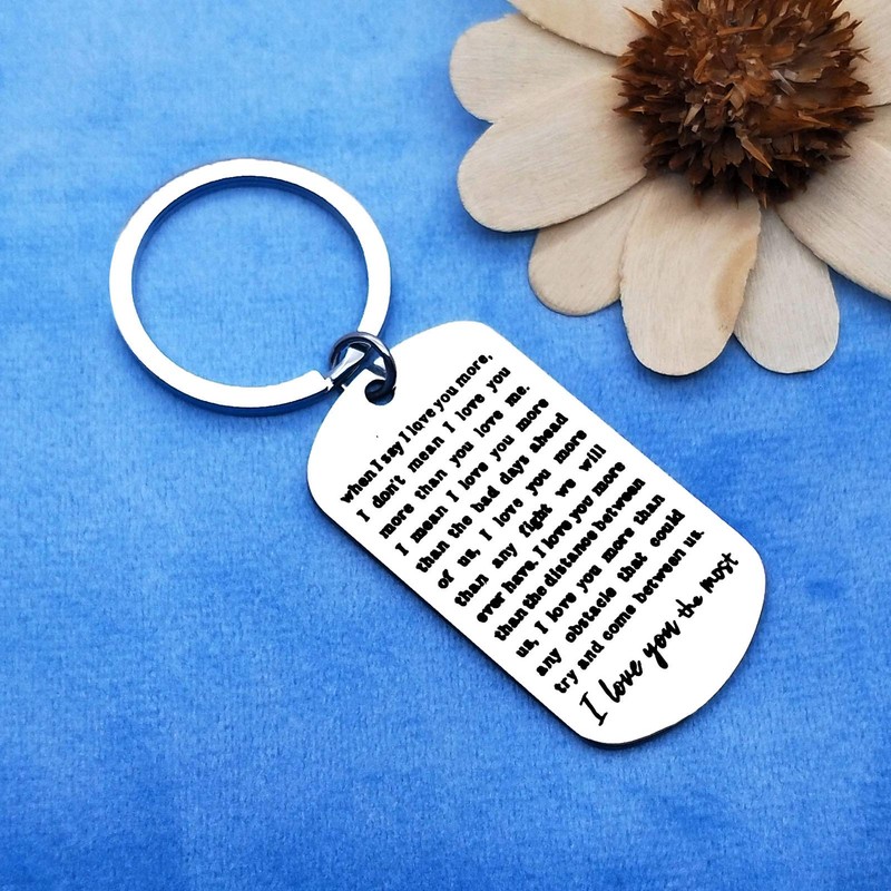 - Lover Gift Couple Keychain:"When I say I love you more, I don't mean I love you more than you love me. I mean I love you more than the bad days ahead of us, I love you more than any fight we will ever have. I love you more than the distance between us, I love you more than any obstacle that could try and come between us. I love you the more."Keychain.Make a great gift for your girlfriend,boyfriend,wife,husband or anyone your loved.