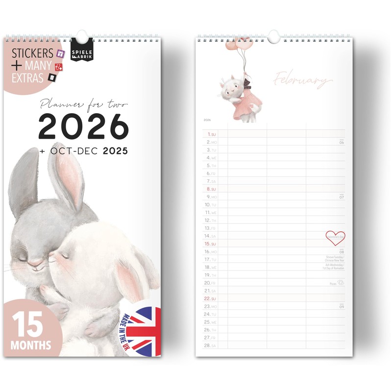 Couple planner 2026 3 columns LOVE & FRIENDSHIP planner for two 2026 and Oct-Dec 2025, partner calendar 16x32,5cm, calendar for couples 2026 for 2 persons, cute animal illustrations (2026)