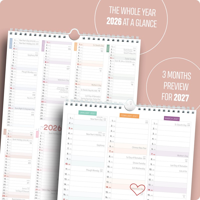 - ➕ INCLUDING MORE SPECIAL CALENDARS - Our family organiser has even more to offer! On each full page you will find: A yearly overview for the complete calendar year with space for many entries / A preview of the first 3 months of the following year / Zodiac sign calendar: Every month you can see from when which zodiac sign is current.