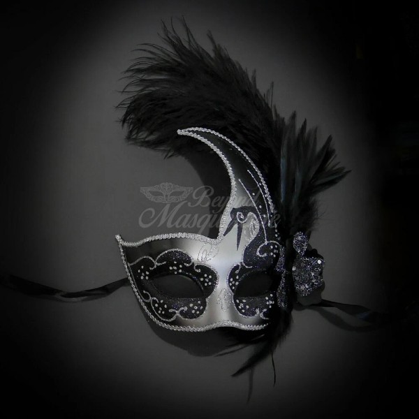 Couples Masquerade Masks | Feather Masquerade Mask Silver Black
