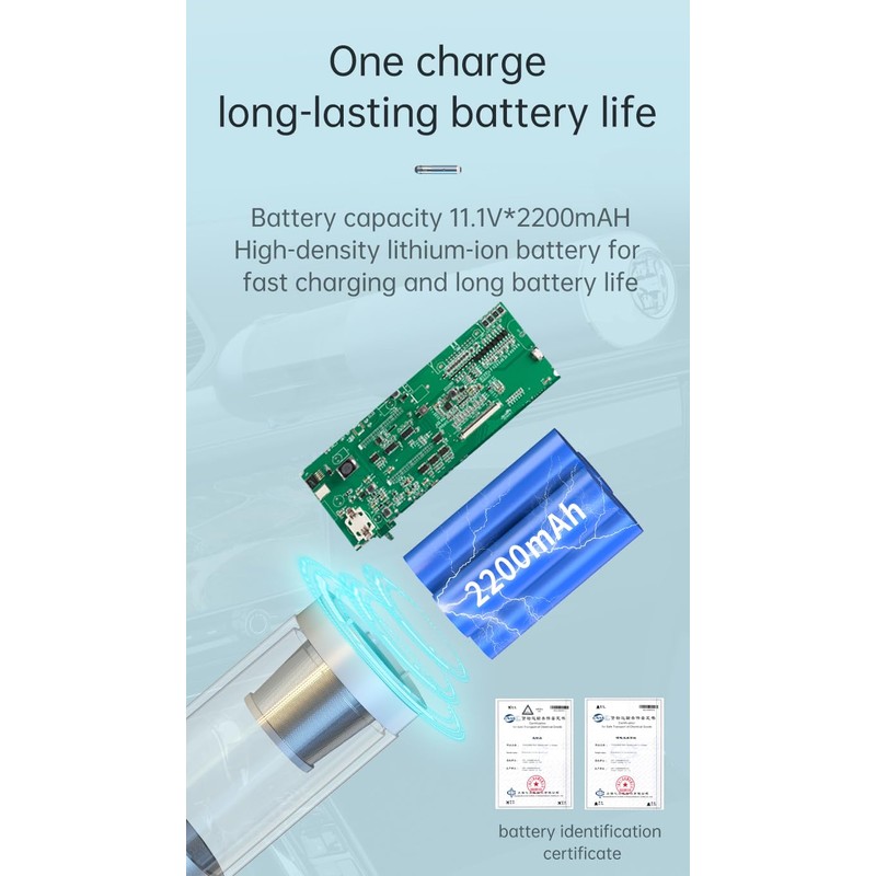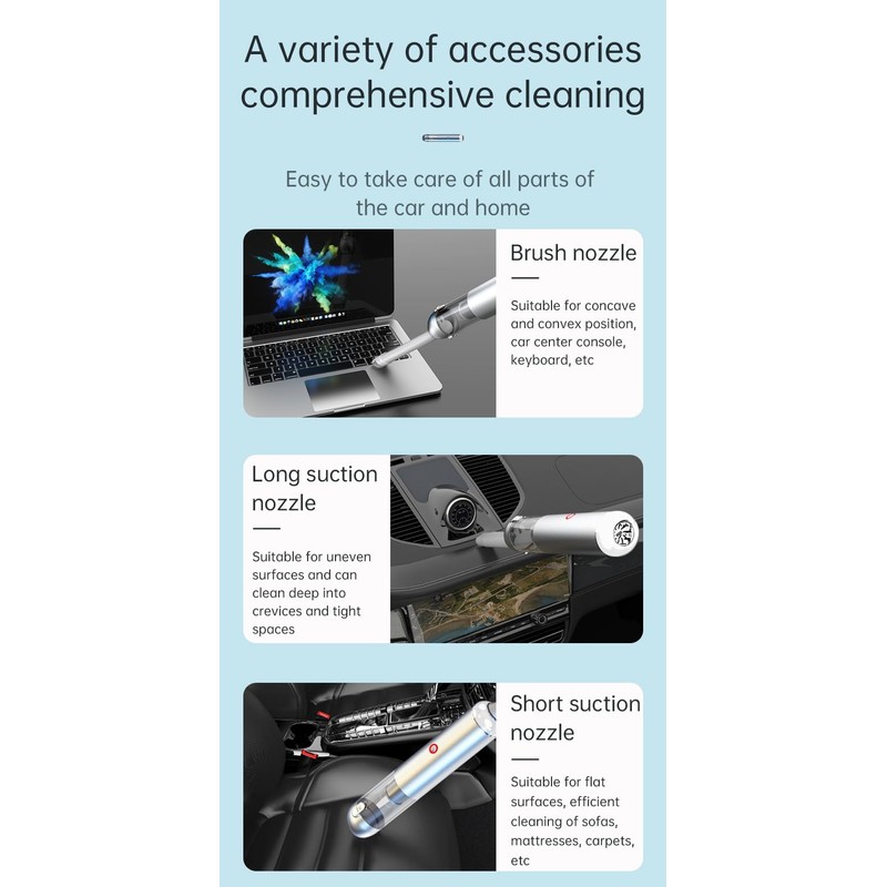 - 1. Powerful Suction for Effective Cleaning The V11S features a high-powered 120W motor that delivers up to 15KPa of suction, effortlessly tackling various cleaning tasks inside your car. Whether it’s fine dust, stubborn debris, or pet hair, everything is easily removed. The specialized long nozzle and brush attachments ensure every corner is thoroughly cleaned, keeping your car interior fresh and spotless.