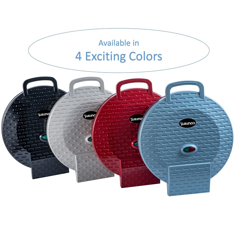 Large Cooking AreaThe 12 diameter cooking area features cooking plates on the top and bottom for even cooking throughout and provides a delicious crispy crust. Non-stick coating on baking plates make it easy to wipe clean after every use and helps eliminate any gooey leftovers.Mmmm, your favorite homemade pizza in no time! Don't go hungry!Have yourself a hot and crispy 12 inch Pizza in under 15 minutes with the CPM-1220 by Courant. Brilliantly designed with nonstick plates and Compact size for easy storage. It's always a good time for Pizza! FRESH OR REHEAT with that crispy crust. Bake Chicken Cutlets, Meat, or any sort of Snacks, Quesadillas, Nachos, Mini Frittatas, Quiche, Croissants, Giant Cookies, or JUST ABOUT ANYTHING! Heats up FAST with its Top & Bottom Hating Plates + Non-stick coated cooking plates for easy clean up. Power-on and Ready-to-Cook indicator lights keep you in the know when the Oven is ready to cook. The Oven is compact to fit about anywhere in the kitchen when is use, and stands upright for easy and compact storage SAFETY FIRST: with the Newly improved Cool-touch Handle, Unit Dimensions: 13x15.63x 3.95 (LxWxH) Power cord length 28. Unit Weight 5.5 lbs ETL Certified, Power: 1440 Watts, 120V, 60Hz.Much more than a Pizza MakerIt's much more than a pizza Maker, it make quesadillas, nachos, mini frittatas, quiche, croissants, giant cookies, hors d'oeuvres Mini Pizzas, S'mores Pie, Cinnamon Buns, Chocolate Chip Cookie, Cheese Nachos, Party Mix, Omelets and much more.Portable and LightweightFavorite companion if you need to be away from home for a while since it's lightweight, easy to store and carry around!Impress your guest and share!How many times you gather with friends and family and the most common solution is to order pizza? Well, now you can enjoy doing it at home! Either you choose to do it from zero or heat a frozen pizza it will taste just as good and right at home.
