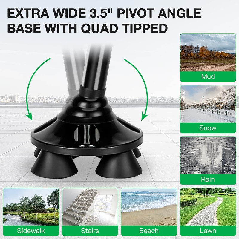 - 【Base with Pivot System】Covacure walking cane is designed with a pivot system that allows it to adjust to the surface and maintain maximum ground contact, stability and balance. It have nonslip rubber foot pads that make them suitable for sidewalks, stairs, beaches, lawns, rain, snow, mud and so on.