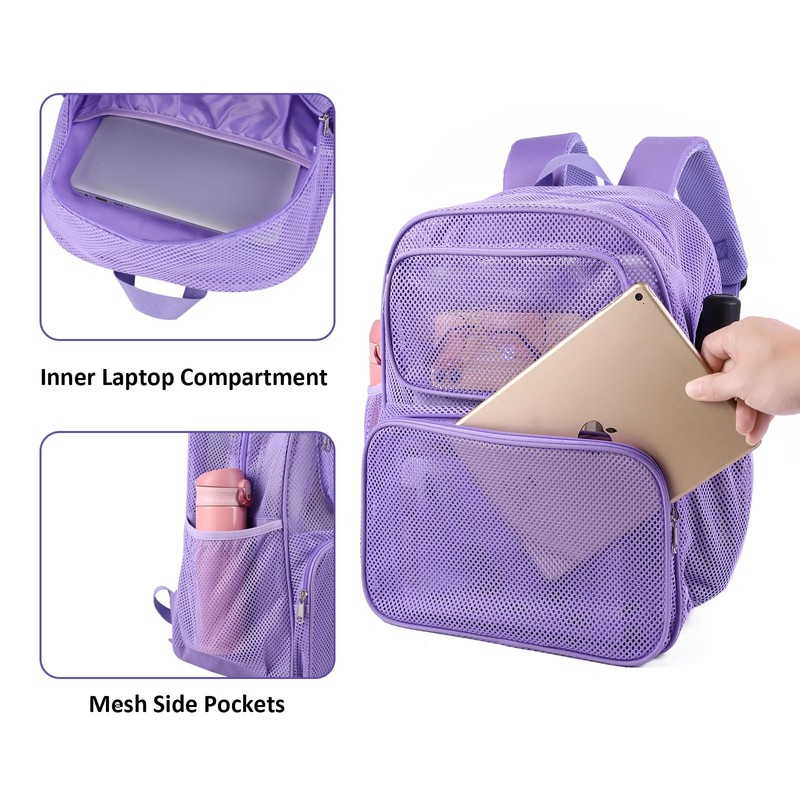 COVAX Large Mesh Backpack, Semi-transparent College Backpack, See Through Mesh Backpack with Bungee and Comfort Padded Straps for Travel, Swimming, Beach, Outdoor Sports (Purple)