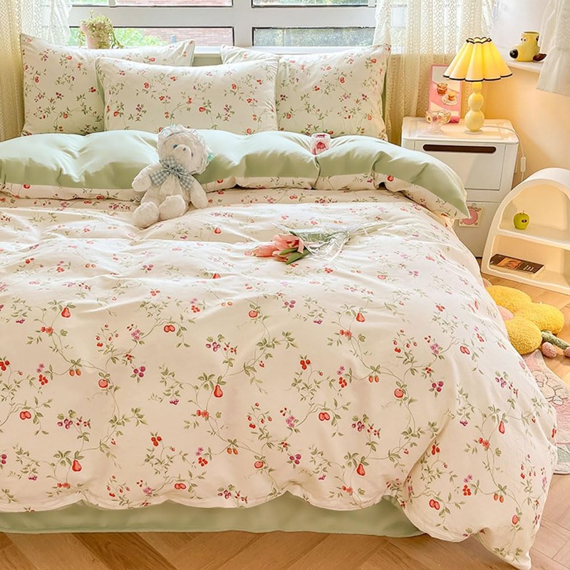 - Design: reversible bedding set, white duvet cover with green leaves and small pink and red floral patterns, fresh and natural printed, the other side is simple and fashionable green, easy to match different styles of the bedroom, which not only provide you a good sleeping environment, but also a lively and interesting atmosphere to your bedroom.