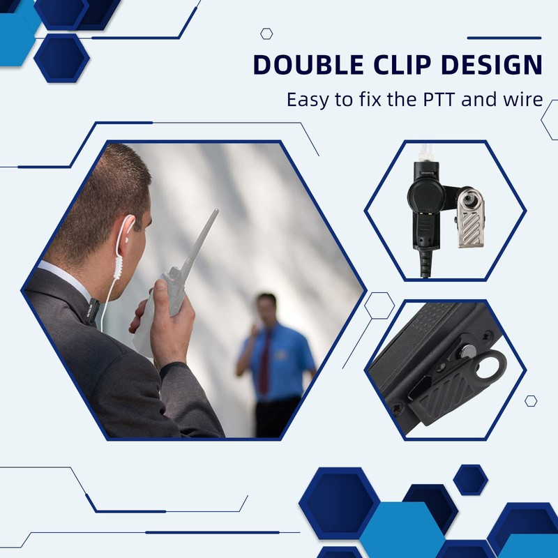 - Double-wire design; the pin and earplug of the earphone of the two-way radio headset are located on both sides of the microphone; it is convenient to hang the radios on the waist