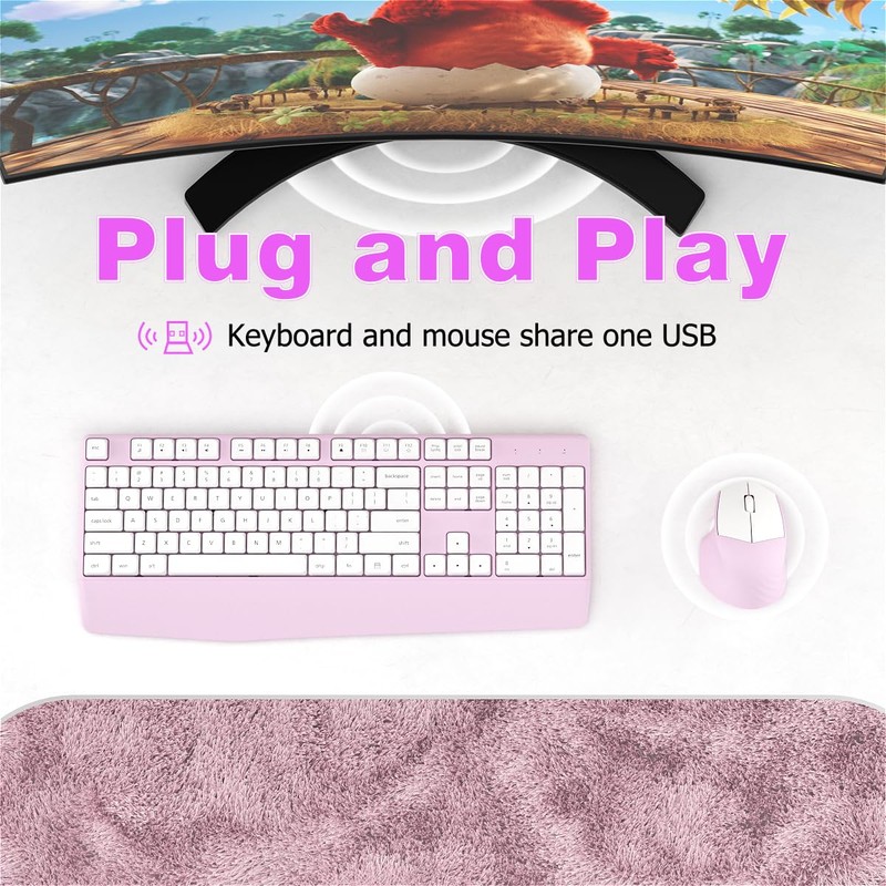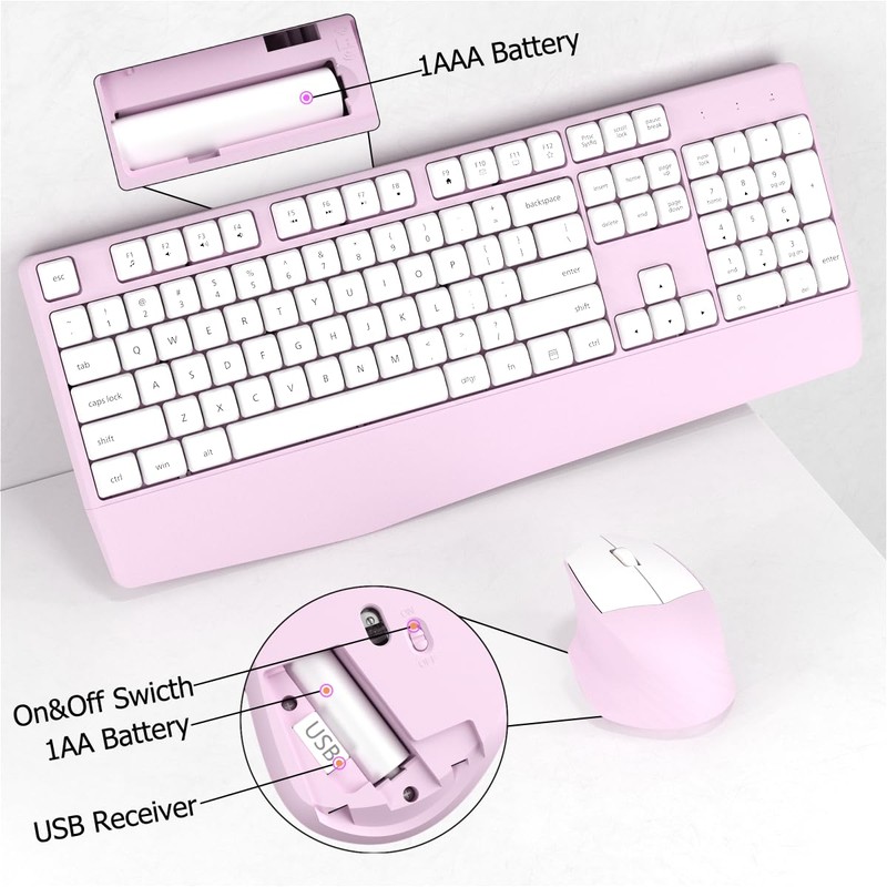 COVEVA Wireless Keyboard and Mouse Combo, Ergonomic Keyboard with Wrist Rest and Wireless Mouse, 2.4Ghz Wireless Connection, Compatible with PC/Laptop/Windows/Mac for Home and Office Use (White Pink)