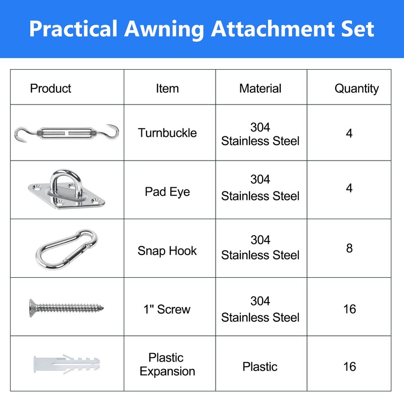 - Sun Shade Sail Installation Kit: Heavy-duty stainless steel hardware kit for sun shade installation, designed for durability and reliability, heavy-duty hardware for fixing the screen, and work for the sun shade to keep it in tension.