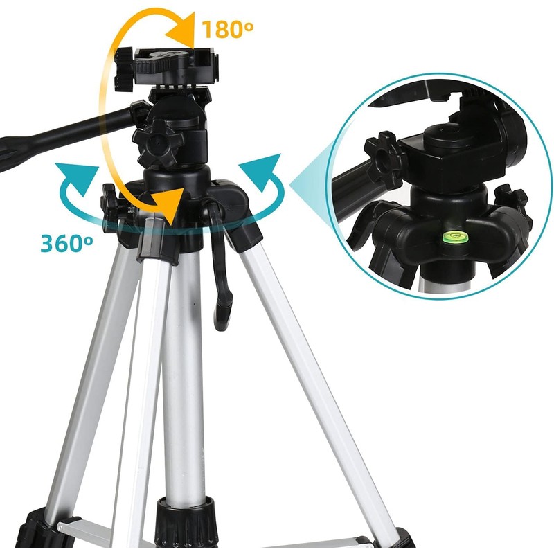 • Aluminum Tripod: The tripod has four sections, the height can be adjusted from about 40cm to 104cm. To increase the stability of the tripod, you can attach heavy objects to the hook at the bottom.
