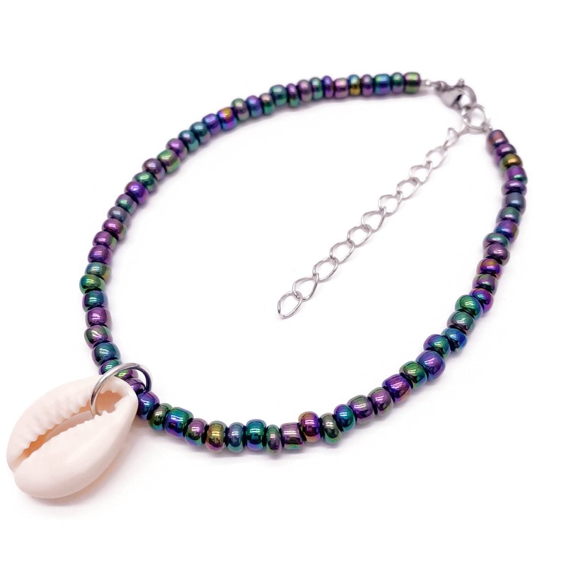 - Beautiful anklet with a cowrie shell charm, on a row of dark AB shimmer colored glass seed beads.