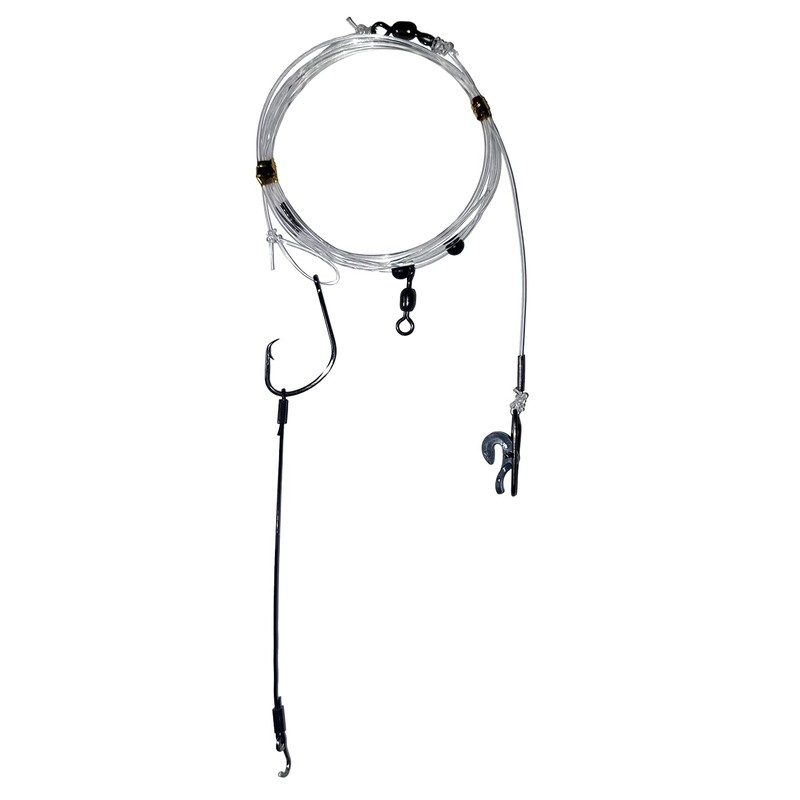 Attached to the hook is the 'dongle', a short 4" length of braid or wire that the hook bait is attached to, rather than being put directly on to the hook itself. This places the bait at the lowest point of the hook gape, next to the point of the circle hook, ensuring maximum hooking potential. The dongle is concealed once baited so cannot be detected by the fish.