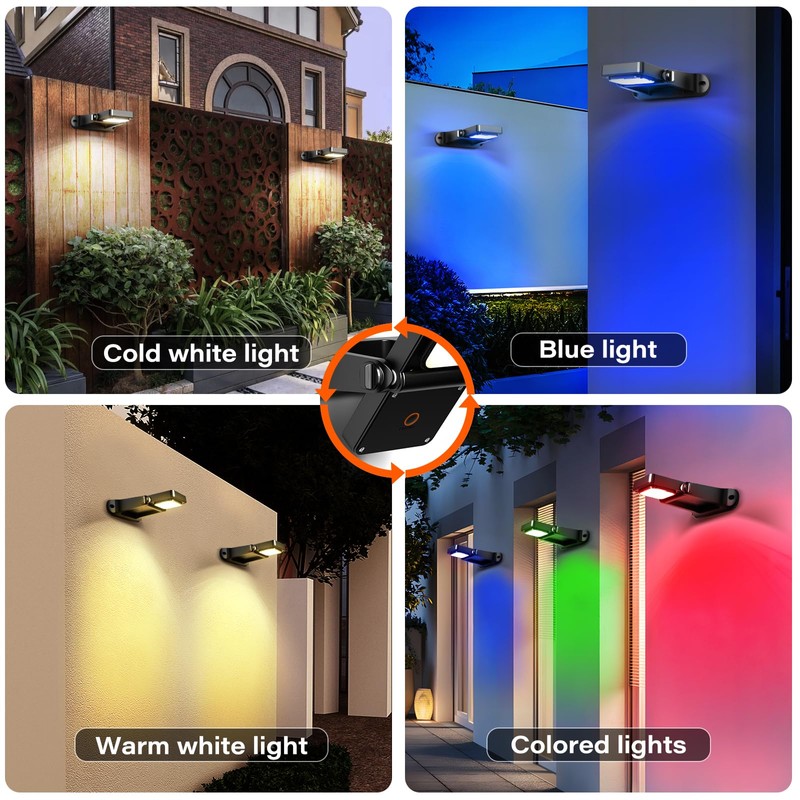 - 6 Modes Solar Lights for fence with 200LM Brightness - Upgrade your outdoor spaces with solar fence lights outdoor waterproof offering 6500K cool white, 3000K warm white, red/blue/green, and RGB color-changing modes. The monocrystalline silicon solar panel powers 200 lumens lighting—ideal for fences, gardens, pathways, and steps.