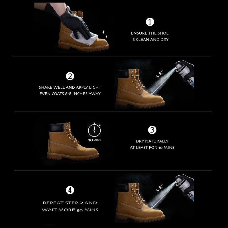 HOW TO USE: Apply your waterproof shoe spray at a distance of 6 to 8 inches away in a well-ventilated area. Clean your shoes before using this sneaker protector spray and allow 30 minutes to dry. 2 coats are enough for your spray to create a water-repellent and stain-resistant coat, Wait for 15-30 minutes to dry between each layer. Let your shoes dry for at least an hour before wearing them. The treatment can Last Up To 4 to 6 Weeks.